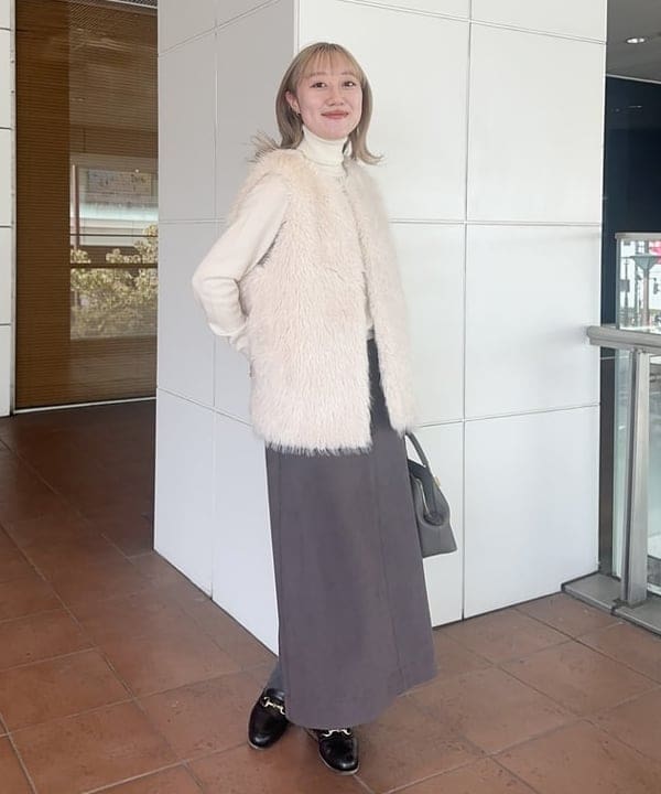 着丈や首周りにこだわり、フェイクファーのボリュームを最大限に活かしたデザイン。中に着るアイテムを選ばず、レイヤードスタイルが楽しめるようにアームホールにゆとりを持たせています。