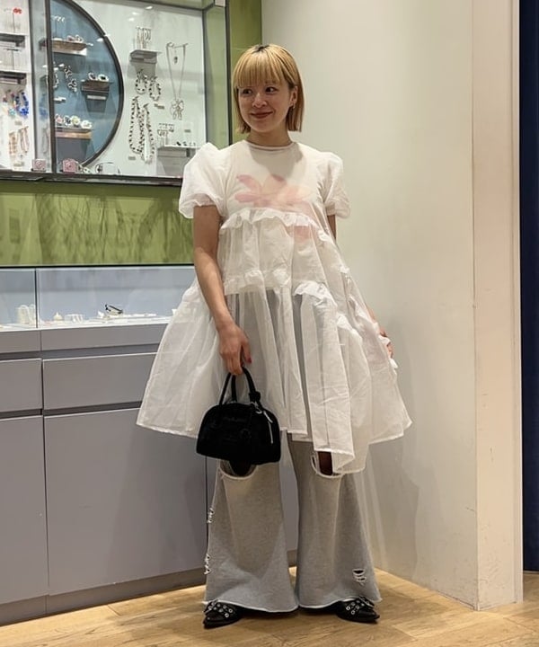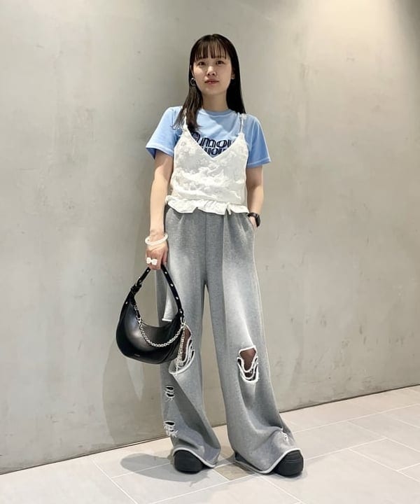 ポイント: エッジが効いたパンツなので、コンパクトなアイテムやレース素材と合わせたトレンド感のあるスタイリングがおすすめ!