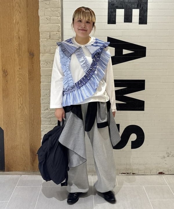 | 素材 | 【WHITE】本体:コットン100% 衿ぐりレース部分:ポリエステル100% その他:コットン100% 【NAVY】本体:コットン100% 衿チェック部分:コットン98%、ポリウレタン2% 右衿下レース部分:ポリエステル100% 左下フリル部分:ポリエステル100% 裾フリル2段目:コットン65%、分類外繊維33%、ポリウレタン2% 裾フリル3段目:ポリエステル100% |