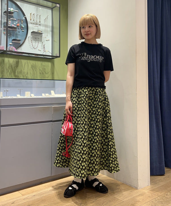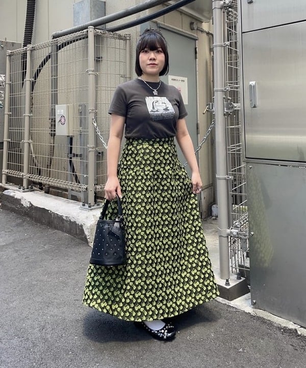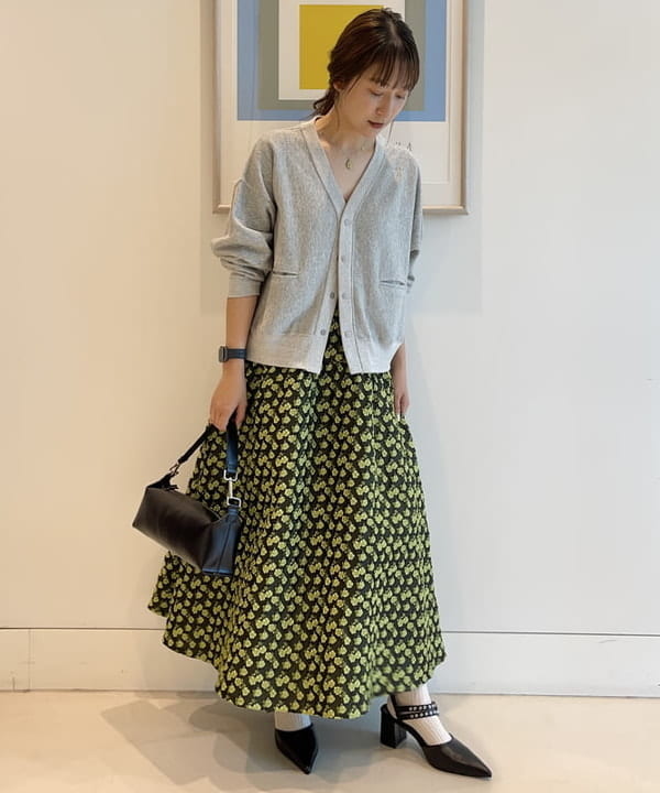 トップスはシンプルなニットやブラウスを合わせると、スカートの柄が引き立ちます。ワントーンでまとまった落ち着いた印象のBLACKと、配色がポップで目を惹くGREENの2色展開なので、スタイルに合わせて選べます。