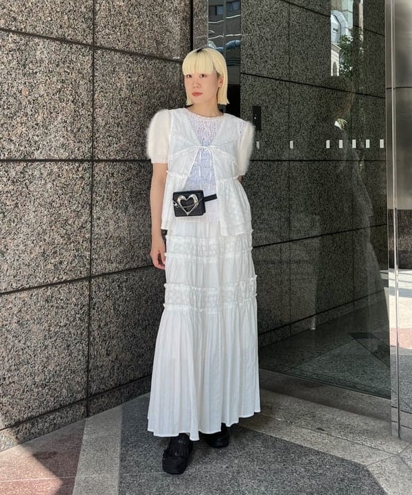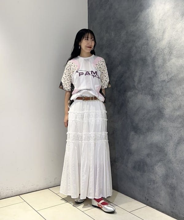 コットンレース生地を3種類使用した、表情豊かなティアードスカート。 フェミニンなレーススカートに、あえて切りっぱなしとロック始末のデザインを加え、抜け感のあるカジュアルさを演出しました。 通常のティアードスカートと異なり、裾の切り替えからふんわりと広がるデザインに。広がりすぎない上品なシルエットで、普段使いはもちろん、お出かけにもぴったりです。
