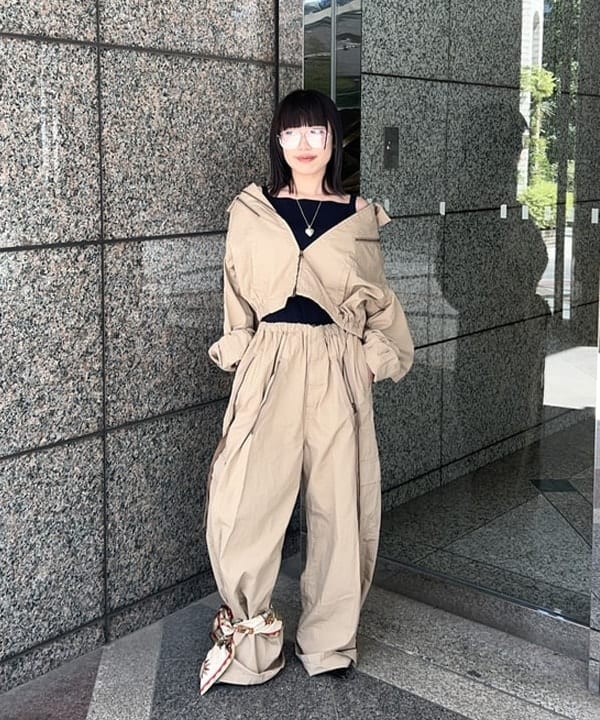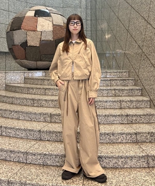 ボリューム感のあるワイドシルエットなので、タイトめのカットソーやコンパクトなトップスと合わせると、スタイルアップ効果が期待できます。同素材を使用したブルゾン【品番: 13-18-0696-791】とのセットアップスタイルもおすすめです。