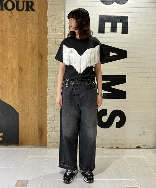 デニムやワイドパンツと合わせたクールな着こなしがおすすめです。また、ジャケットやブルゾンのインナーからフリンジをさりげなく覗かせるレイヤードスタイルも◎。シンプルな着こなしにアクセントを加えたい時にぴったりの1枚です。