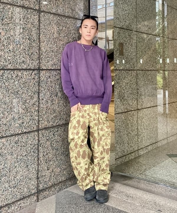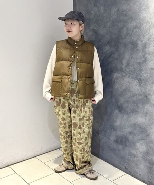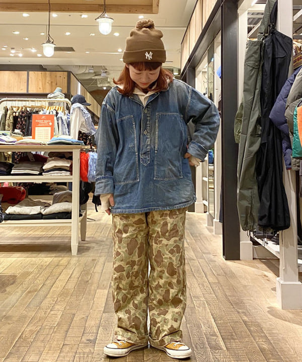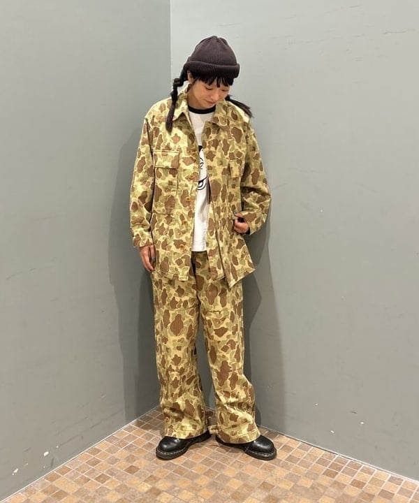 高密度で強度のあるヘリンボーンツイルにプリントされた迷彩柄が特徴の別注アイテム。太ももの両サイドに配された、マチ付きの大型フラップポケット。そして、前立て裏に設けられた、当時毒ガス侵入を防ぐためのディテールである持ち出しの大きい「ガスフラップ」です。膝部分は、補強として生地を二重にしたダブルニー仕様。裾にはタブが取り付けられており、絞ってシルエットを調節することが可能です。