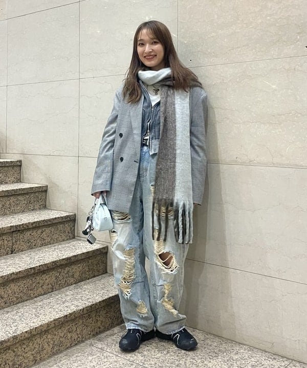 首元を彩るラインの配色がポイントのマフラー。太めのフリンジがコーディネートに遊び心をプラス。巻くだけで、顔周りに洗練された印象を与えます。