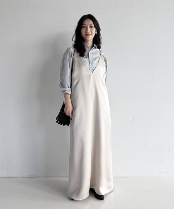 シャツやカットソーをインナーに重ねてこなれ感漂うレイヤードスタイルに。足元はフラットシューズでカジュアルに、ヒールを合わせればお呼ばれシーンにも活躍します。