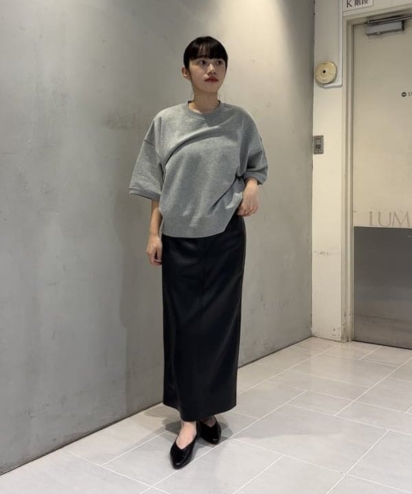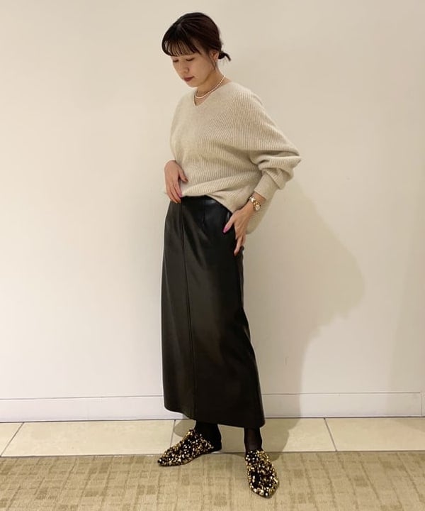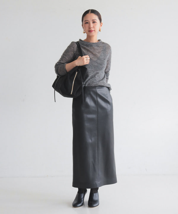 ライトウェイトに仕上げたフェイクレザーのスカート。センターに縫い目とステッチを施し、縦見えによる美しいシルエットにこだわりました。