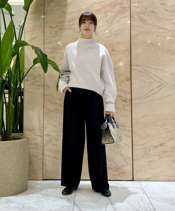 袖口のバイカラーデザインがさりげないアクセントを添えます。首元を締め付けず優しく包み込むモックネックにユニークな編み柄をプラス。裾に前後差があり、気になるヒップラインをカバーしつつ、前はすっきりと見せてくれます。