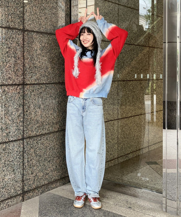 ゆるっとカーブを描くバギーダッドバレルシルエットが魅力のデニムです。ミッドライズで腰まわりはすっきり、程よいゆとりが脚のラインをきれいに見せてくれます。全体にさりげなく施されたラインストーンが、きらりと輝くアクセント。ほんのり色落ちを効かせたインディゴブルーは、立体感のある表情が魅力です。