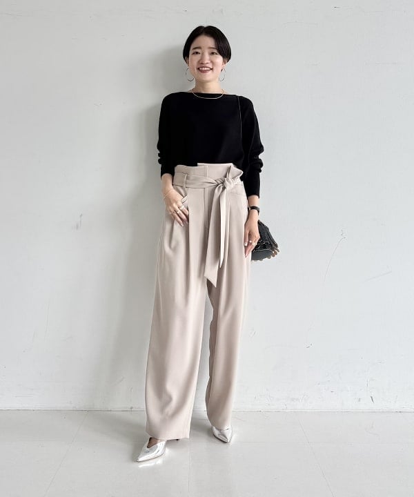 共布のロングベルトがポイント。腰まわりをすっきりと見せつつ、タックの落ち感が脚のラインを美しくカバーします。