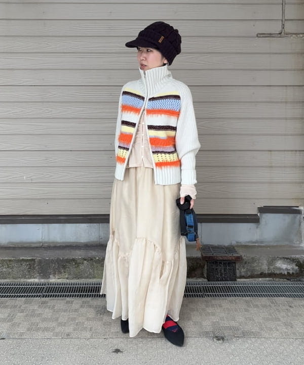 ハイウエストのデニムやスラックスを合わせ、コンパクトな着丈を活かした旬のバランスがおすすめ。やや透け感があるため、インナーの色遊びによって異なる雰囲気を演出できます。