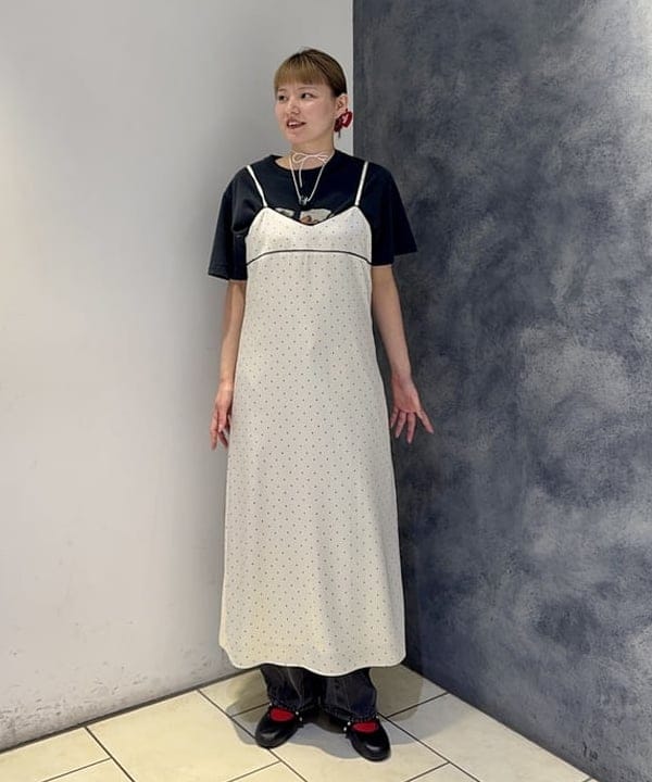 今季大注目のドット柄を施した、大人可愛いキャミソールワンピースが登場。表面感のある上品なサテン生地を使用し、テカリすぎない絶妙な光沢感で高級感を演出しました。