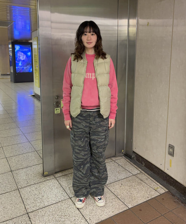 綿素材のリップ生地に地染め+顔料プリント+ストーンバイオの加工を施すことで、リアルに経年変化で退色したようなムードに仕上げました。タイガーカモ柄はオリジナルで柄を組んでおり、〈BEAMS BOY(ビームス ボーイ)〉ロゴにも用いられている“寝ころびハート”をさりげなく忍ばせ、遊び心のあるデザインに仕上げています。